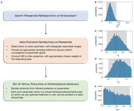 (A), The Standing Variations Modeling methodology. Representative inferred posterior distributions of model parameters, namely: (B), , ADT-induced death rate of androgen sensitive cancer cells; (C), , proliferation rate of androgen sensitive cancer cell; (D), , maximum rate of naïve CD8 T cell activation by mature APCs; and (E), , fraction of ADT-induced cell death that is necrotic. Shown also are 95% confidence bounds (shaded gray areas) and median values (dashed black lines).