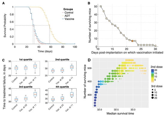 Encouraged by our finding that early administration of vaccine improves the survival chances of mice, we instead sought to maximize the number of survivors at the end of the trial, on the same cohort of 50,000 mice. Once again, initiating treatment at the earliest possible time-point (day 11) was found to be optimal. The number of surviving mice are plotted on the y-axis as a function of inter-dose intervals, in Figure 4D. A maximum of 580 mice (1.16%) survive, of which 395 are cured (tumor size mm), if the first two vaccine doses are given within 3 days of each other, whilst the third dose is administered 13–15 days later. This is a marked improvement from the 7 survivors out of 5000 (0.14%) when mice were vaccinated starting on day 22, on a weekly schedule. We remark that the number of surviving mice (equivalently, the higher quantiles of the survival time) is more sensitive to differences in strategy than is the median survival time. This is typical in biomedical studies where only a subpopulation of patients benefit from the intervention (for a review, see []).