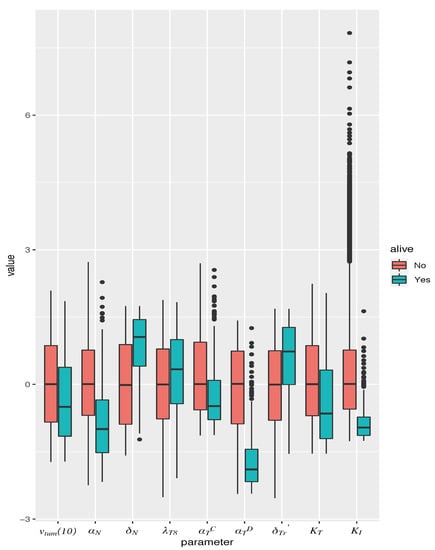 Box plot of parameter values in simulated mice, giving median and inter-quartile range. Parameters are normalized to mean and standard deviation across all simulated mice. Only those parameters are represented that were found to be significantly associated with a cure (tumor size 1 mm) when vaccination is administered as a monotherapy, on the optimal schedule predicted by the model. Red boxes correspond to dead mice, and teal boxes correspond to cured mice.