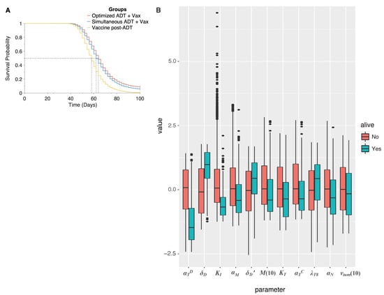 (A), Overall survival of simulated mice from time of combination treatment initiation, on various schedules. (B) Box plot of parameter values in simulated mice, giving median and inter-quartile range. Parameters are normalized to mean and standard deviation across all simulated mice. Only those parameters are represented that were found to be significantly associated with a cure (tumor size 1 mm) when ADT and vaccination are administered as a combination, on the optimal schedule predicted by the model. Red boxes correspond to dead mice, and teal boxes correspond to cured mice.