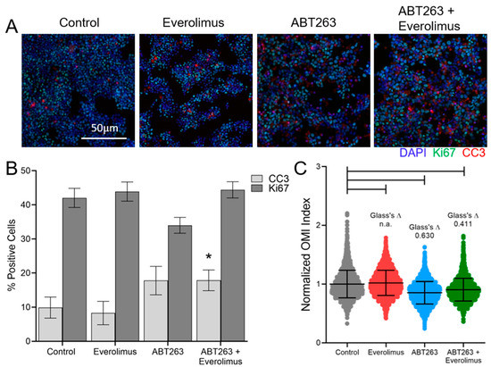 ABT263 and everolimus combination therapy increases cell death and decreases optical metabolic imaging (OMI) index. (A) Representative images of STC-1 cells stained for Ki67 (green) and CC3 (red), with DAPI stained nuclei (blue), (B) Quantified results from the stain show the number of DAPI cells that were also positive for Ki67 or CC3. There was a significant increase in the percent positive CC3 cells with combination treatment vs. control; * indicates p < 0.05, using an ANOVA (n = 24 regions of interest), (C) Quantified OMI index [linear combination of NAD(P)H mean lifetime (τm), FAD τm, and redox ratio with the coefficients [1, 1, −1], respectively from STC-1 cells treated with ABT263 and everolimus. Redox Ratio is defined as NAD(P)H intensity/FAD Intensity. Bars indicate p < 0.01 from an ANOVA (n = 2500 cells). Glass’s delta (Δ) values are also shown for treatment vs. control conditions, n.a. indicates non-applicable Glass Δ due to increase in OMI index (decrease in OMI index indicates drug response, increase or no change in OMI index indicates non-response [20]).