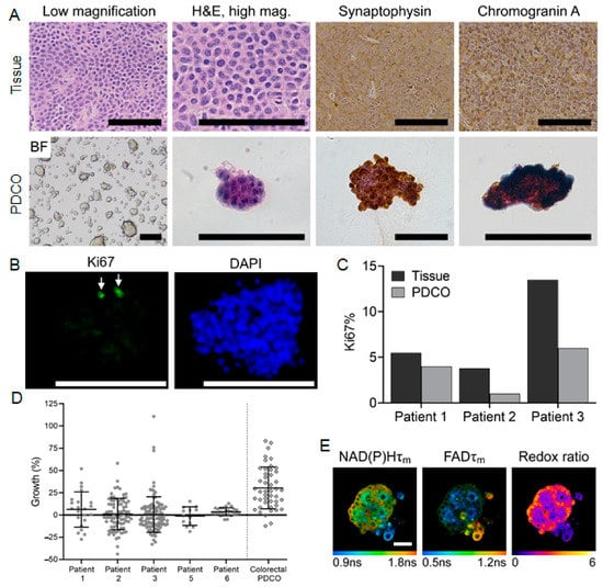 GEP-NET PDCOs maintain key phenotypic characteristics of patient GEP-NETs. (A) Comparison of H&E and GEP-NET specific stains, synaptophysin and chromogranin A, between tumor slices and PDCOs from a single patient; scale bars 100 µm, (B) Ki67 and DAPI stained PDCOs show slow low percentage of cells with Ki67 staining. Ki67+ cells are marked by white arrow; scale bar 100 µm, (C) percent Ki67 positive cells assessed from PDCOs and the patient tissue from which they were derived, (D) scatter plots of PDCO growth after 7 days of culture. Growth % = [(day 7 diameter − day 1 diameter)/day 1 diameter] × 100. Each datapoint is one organoid. GEP-NET PDCOs have relatively low growth rates compared to fast growing colorectal cancer (diamonds). See Table S1 for sample sizes, (E) optical metabolic imaging of the NAD(P)H mean lifetime (τm), FAD τm, and the Redox Ratio (NAD(P)H intensity/FAD Intensity) for a representative GEP-NET PDCO sample, which indicates that the cells are metabolically active even with low proliferation rates; scale bar 50 µm; ns indicates “nanoseconds”.