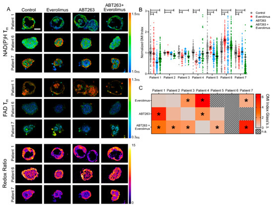 PDCOs grew four days prior to treatment. There is some difference in the organoid diameter between patient samples at beginning of treatment, but all PDCOs had a diameter of less than 200 mm. For treatment, the regular media were replaced with media containing physiologically relevant doses of the different treatments (250 nM ABT263 and 200 nM everolimus) [38,39,40,41]. PDCOs were kept in treatment media for 72 h prior to imaging. The media conditions in which the PDCOs are maintained contain supra-physiological concentrations of pyruvate, glucose and other key metabolic substrates, to avoid the confounds of limited substrate availability [32]. Fluorescence lifetime images were taken on a custom-built inverted multiphoton microscope (Bruker Fluorescence Microscopy, Middleton, WI, USA), as previously described [35,42]. Briefly, the system consists of an ultrafast laser (Spectra Physics, Insight DS-Dual, Milpitas, CA, USA), an inverted microscope (Nikon, Eclipse Ti, Tokyo, Japan), and a 40× water immersion (1.15NA, Nikon) objective. NAD(P)H and FAD images were acquired sequentially for the same field of view using an excitation wavelength of 750 nm and a 440/80 nm emission bandpass filter for NAD(P)H fluorescence, and an excitation wavelength of 890 nm and a 550/100 nm emission bandpass filter for FAD fluorescence. Fluorescence lifetime images were collected using time-correlated single photon counting electronics (SPC-150, Becker and Hickl, Berlin, Germany) and a GaAsP photomultiplier tube (H7422P-40, Hamamatsu Photonics, Hamamatsu, Japan). A pixel dwell time of 4.8 μs was used to acquire 256 × 256 pixel images over 60 s total integration time. The photon count rates were maintained at 1–2 × 105 photons/second to ensure adequate photon observations for lifetime decay fits, and no photobleaching. The instrument response function was measured from second harmonic generation of urea crystals excited at 900 nm, and the full width at half maximum (FWHM) was calculated to be 220 ps. A Fluoresbrite YG microsphere (Polysciences Inc., Warrington, PA, USA) was imaged as a daily standard for fluorescence lifetime. The lifetime decay curves were fit to a single exponential decay and the fluorescence lifetime was measured to be 2.1 ns (n = 7), which is consistent with published values [29,42].