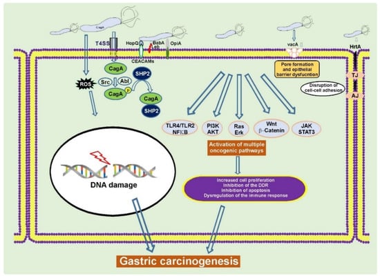 H. pylori alters cellular homeostasis during infection. H. pylori colonization of the human stomach is responsible for aberrant activation of multiple oncogenic pathways, induction of DNA damage, disruption of the epithelial barrier, and modulation of the host immune response. CagA, VacA, and other virulence factors play a key role in these processes [22,25,26].
