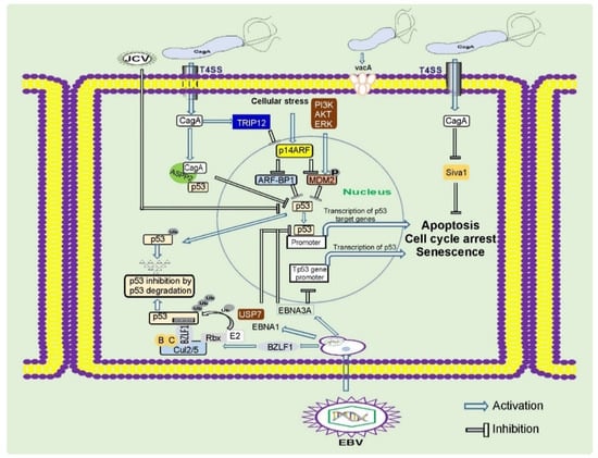 Similar to H. pylori, EBV inhibits activity of p53 tumor suppressor. Interestingly, multiple viral proteins are involved in this process. EBNA1 and EBNA3C repress p53-dependent transcription and augment its ubiquitination and degradation [206]. The immediate-early protein BZLF1 (BamHI Z fragment leftward open reading frame 1) also inhibits p53-dependent transcription [207,208]. This protein functions as an adaptor component of the ECS ubiquitin ligase complex (Elongin B/C-Cul2/5-SOCS-box protein) that facilitates p53 degradation [209] (Figure 2). Direct viral inhibition of p53 might explain why EBVaGC rarely harbors mutations in the TP53 gene [7].