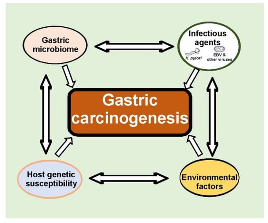 Multifaceted interactions between infectious agents, gastric microbiomes, and host genetic and environmental factors define tumorigenic processes in the stomach. Many aspects of these interactions remain currently unknown.