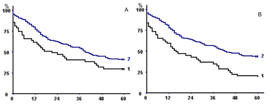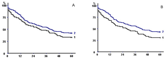 (A,B) Kaplan–Meier survival curves in the whole population with respect to (A) fat excluded sarcopenia of both psoas and parietal muscles and (B) sarcopenia of both psoas and parietal muscles (without fat exclusion). In both panels, curve 1 represents sarcopenic patients; curve 2 non-sarcopenic. (C) Kaplan–Meier survival curves with respect to sarcopenia of both psoas and parietal muscles (without fat exclusion) taking into account only operative survivors. (D) Kaplan–Meier survival curves of male operative survivors with total muscular fat <25th percentile (1) versus >25 percentile (2).