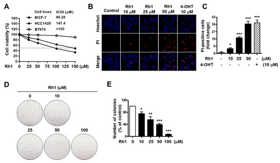 To investigate the anticancer effects of Rh1 on BC, MCF-7, HCC1428, and BT474 cells were treated with different concentrations of Rh1 (25, 50, 100, and 150 µM) for 72 h, and a sulforhodamine B (SRB) assay was then performed to analyze the cell viability. Four-parameter logistic regression was also assessed to determine the half-maximal inhibitory concentration (IC50) values. The IC50 values of Rh1 in MCF-7, HCC1428, and BT474 cells were 90.28 µM, 147.4 µM, and >150 µM, respectively. The highest inhibitory effect of Rh1 on the cell viability was observed in the MCF-7 cells (Figure 1A). Next, to confirm the effects of Rh1 on the cell viability with morphological changes, MCF-7 cells were stained with the red fluorescent dye propidium iodide (PI) and counterstained with Hoechst 33342 nucleic acid stain for nuclei indication. PI-stained dead cell nuclei was significantly induced by Rh1 treatment; particularly, 50-µM Rh1-induced dead cell nuclei populations were similar to 10-µM 4-hydroxytamoxifen (4-OHT) treatment (Figure 1B,C). Furthermore, the inhibitory effect of Rh1 was confirmed using a clonogenic assay. Colony formation was significantly decreased by treatment with Rh1 from a concentration of 10 µM; in particular, Rh1 almost suppressed the cell reproductive viability at a concentration of 100 µM (Figure 1D,E).