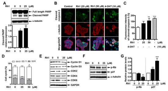 Rh1 induced cell apoptosis and cell cycle arrest in MCF-7 cells. (A) The cells were treated with Rh1 (0, 5, and 25 µM) for 24 h. Whole-cell lysates were then used to analyze the protein expression as indicated. α-tubulin was used as a loading control. (B,C) The cells were treated with Rh1 (0, 25, and 50 µM) or 4-OHT (10 µM) for 24 h. An immunofluorescence analysis was performed after fixing and immunostaining. Images are shown at ×200 magnification (B). Scale bar indicates 30 μm. Quantified graph showed the relative fluorescent intensity of cleaved caspase-3 using Image J software (C). (D) MCF-7 cells were treated with Rh1 at different concentrations for 24h. After the treatment, the cells were harvested for the cell cycle distribution analysis using flow cytometry. (E) The cells were treated with Rh1 (0, 5, and 25 µM) for 24 h. Total cell lysates were analyzed by Western blotting using the indicated antibodies. (F,G) The cells were treated with Rh1 (0, 5, and 25 µM) for 24 h. Total cell lysates were analyzed by Western blotting using the indicated antibodies (F). The relative quantification of the protein levels was analyzed by Image J software (G). (A,C,D,G) Data are expressed as the mean ± SD (n = 5), * p < 0.05, ** p < 0.01, and *** p < 0.001 as compared with the control. 4-OHT: 4-hydroxytamoxifen, CDK: cyclin-dependent kinase, and GAPDH: glyceraldehyde 3-phosphate dehydrogenase.