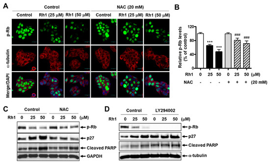 To determine whether Rh1-induced cell apoptosis and cell cycle arrest would mediate the role of ROS, MCF-7 cells were pre-incubated with 20-mM NAC before exposure to Rh1 for 24 h. An immunofluorescence analysis revealed that Rh1 (25 and 50 µM) significantly inhibited the phosphorylation of Rb in MCF-7 cells, whereas a pretreatment with 20-mM NAC recovered this effect (Figure 4A,B). Consistently, the Rh1-induced upregulation of p27 expression and downregulation of Rb phosphorylation were rescued by the presence of NAC (Figure 4C). In addition, ROS inhibition reduced the elevated protein expression of cleaved PARP caused by Rh1 (Figure 4C). Furthermore, the role of the PI3K pathway in Rh1-produced cell apoptosis and cell cycle arrest in MCF-7 cells was confirmed by using LY294002. The cells were pretreated with 5-µM LY294002 for 3 h and then exposed to Rh1 for 24 h. As seen in Figure 4D, inhibition of the PI3K pathway by LY294002 further increased the protein expression of cleaved PARP and p27 and further decreased the phosphorylation of p-Rb compared to the sample treated with Rh1 alone. Taken together, these data indicate that Rh1-induced cell apoptosis and cell cycle arrest are associated with the PI3K pathway and ROS modulation.