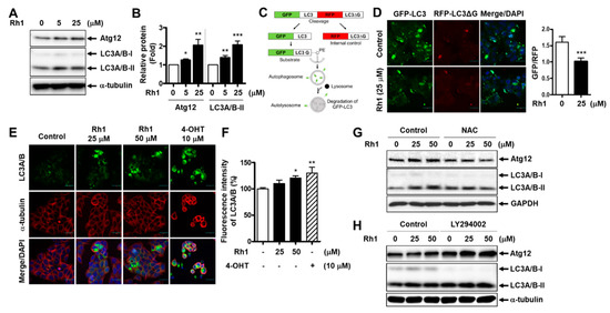 To determine whether the anticancer effect of Rh1 could be related to autophagy induction, MCF-7 cells were pretreated with 10-µM 3-methyladenine (3-MA), an autophagy inhibitor, before treatment with Rh1 for 24 h. Cell viability was then analyzed through the SRB assay. The data showed that Rh1-decreased cell viability was partially reversed by 3-MA, indicating that Rh1-induced cell death is related to autophagy (Figure S3). Next, the expression of autophagy-related proteins was examined in Rh1-treated cells. The Western blot analysis showed that Rh1 treatment increased the expression of Atg12 and LC3A/B-II compared to that in the control groups in MCF-7 cells (Figure 5A,B). Notably, to demonstrate the effects of the compound on the autophagic flux, a dual green fluorescent protein (GFP)/red fluorescent protein (RFP)-LC3 autophagy flux sensor system was used. This system is based on the expression of the GFP-LC3-RFP-LC3ΔG fusion protein, which consists of GFP fused to wild-type LC3 and RFP fused to the LC3 Gly120 mutant [26]. This fusion protein is intracellularly cleaved by ATG4 proteases into equimolar ratios. GFP-LC3 is localized in autophagosomes and is partly degraded in autolysosomes due to the induction of autophagy. Meanwhile, the mutated RFP-LC3ΔG cannot be conjugated to autophagosomes, which is not affected by autophagy, thus serving as an internal control (Figure 5C) [26]. There was an overall decrease in the relative ratio of GFP/RFP in GFP-LC3-RFP-LC3ΔG reporter-expressing MCF-7 cells treated with Rh1, as compared to the untreated cells (Figure 5D). This indicates an enhancement of autophagy flux in cells exposed to Rh1. In addition, the increased expression of LC3A/B in MCF-7 cells treated with Rh1 was confirmed by an immunofluorescence analysis (Figure 5E,F).