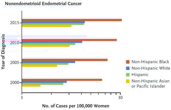 Type II histological subtypes include predominantly USC, and also clear cell, carcinosarcoma and high-grade endometroid cancer and mixed (typically endometrioid and a high-grade nonendometrioid pattern) [13]. In multiple studies, Black endometrial cancer patients had higher incidences of these aggressive histologic subtypes in comparison with non-Hispanic White patients [12,14,15,16,17,18,19]. Overall, Black patients have the highest incidence of these most aggressive, nonendometrioid histologies of endometrial cancer in the US population (Figure 2) [15].