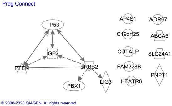 We conducted an Ingenuity analysis to identify associations between proteins exhibiting altered expression in endometrial cancer specimens from Black compared with White patients and that were also prognostically significant in Black patients (Figure 3). The analysis demonstrated that p53 transcription factor increases the expression of PTEN, HER2/NEU and IGF2, proteins which also are known to interact with each other. The missense p53 mutations that can cause p53 protein overexpression, however, often alter the profiles of the genes regulated by p53. HER2/NEU is an indirect upstream regulator of IGF2, LIG3 and PBX1, and IGF2 regulates PTEN expression.