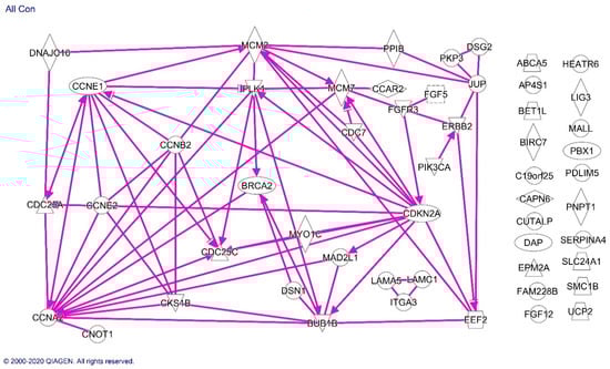 Ingenuity analysis of proteins differentially expressed in endometrioid endometrial cancer specimens from Black compared with White patients. Solid lines indicate direct effects of the indicated protein on the protein to which the arrowhead is pointing. Proteins without arrows had no evidence of a connection with the other proteins in the current scientific literature.
