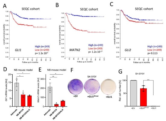 In order to clarify whether Hh/GLI activity exerts pro- or anti-tumorigenic roles in NB, we investigated a publicly available dataset of 498 NB patients (SEQC cohort; GSE49711; GSE62564 [36]). In this dataset, high GLI1 expression was clearly and significantly associated with a better overall survival (Figure 1A). Similar findings were also made for MATN2 (Figure 1B), a GLI1 target gene in NB ([16] and Figure S1A for gene correlation). However, the expression of GLI2 did surprisingly not significantly associate with NB patient survival, possibly explaining some of the uncertainties around Hh/GLI and NB in the field. Using a second independent NB dataset including 476 patients [37], the above findings were identically validated (Figure S2A–C). In line with earlier findings [17], the positive association of GLI1 levels with survival was selective for patients without MYCN gene amplification (Figure S2D,E). Nevertheless, we further found that compared to normal adrenal tissue, the levels of Gli1 and its target gene Matn2 were downregulated in two mouse models of NB [38] (Figure 1D,E), despite the involvement of Mycn overexpression. Finally, we overexpressed human GLI1 in human SH-SY5Y NB cells (Figure 1F). As a control, we used either empty vector or a GLI1 construct carrying mutations in its zinc-finger domain (GLI1ZFmut), rendering this variant functionally inactive as a transcription factor since it is unable to bind to DNA. As can be seen in Figure 1F,G, only the transfection of transcriptionally competent GLI1 led to a block in NB proliferation, despite comparable expression levels of the two constructs (Figure S2F). Taken together, these data strongly support a transcription-dependent tumor-suppressive role for GLI1 in the more frequent NB cases not harboring MYCN amplifications.