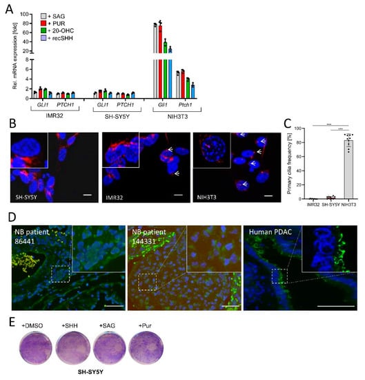 Based on the findings above, therapeutic stimulation of Hh/GLI signaling might appear as an attractive novel approach in NB treatment. Therefore, we tested the impact of four different Hh agonists (SAG, Purmorphamine, 20-Hydroxycholesterol, recombinant SHH) acting on either PTCH1 or SMO. However, none of these agonists was capable of eliciting a Hh signaling response in IMR32 or SH-SY5Y human NB cells (as measured by the expression of Hh target genes (GLI1, PTCH1)), despite the fact that all of these compounds were fully functional in NIH3T3 fibroblasts, a cell line which we used as positive control (Figure 2A). As many tumor entities display a loss of primary cilia on their cancer cells [39,40,41], we investigated the frequency of primary cilia in the two human NB cell lines (Figure 2B). In line with their lack of Hh-responsiveness, there was a drastic drop in primary cilia frequencies in IMR32 and SH-SY5Y cells when compared to NIH3T3 cells, which displayed a cilia frequency of more than 80% (Figure 2C). This lack of cilia occurrence was also observed in two human NB tissue samples, where human pancreatic cancer tissue was used as a positive control and where primary cilia were readily detectable in the ductal epithelium (Figure 2D). These data implied that NB cells lost their ability to form primary cilia and were therefore unable to receive signals from agonists acting at the level of PTCH1 or SMO. As an expected consequence of these findings, treating NB cells with the panel of four different Hh agonists had no effect on their overall proliferation (Figure 2E).