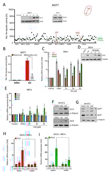 Identification of a small molecule GLI1 inducer. (A) Epigenetic drug screen in MCF7 cells transiently transfected with 8xGLI-Luc reporter plasmid and treated with compounds for 24 h. Shown are mean values of n = 3 relative to DMSO treatment (=100%). HATi: Histone acetyl transferase inhibitors; SIRTi: Sirtuin inhibitors; PADi: Protein arginine deiminase inhibitors; HDACi: Histone deacetylase inhibitors; HMTi: Histone methyl transferase inhibitors; BETi: BET-domain inhibitors; DNMTi: DNA methyl transferase inhibitors; HDMi: Histone demethylase inhibitors. See Supplementary Materials Section for more details. The insets depict Western blots of MCF7 cell lysates after treatment with DMSO or ISX (48 h) as indicated. In the SUFU blot experiment and in the screen, ISX was used at a concentration of 20 µM. (B) Luminometric Hh reporter assay in MCF7 transiently transfected with 8xGLI-Luc or mutated 8xGLI-Luc construct. Cells were treated with DMSO or 20 µM ISX for 24 h. Shown is the mean of n = 5 ± SD. (C) Hh target gene expression (Gli1, Ptch1, Ptch2) in mouse embryonic fibroblasts (MEFs) treated for 48 h as measured by qPCR. SAG: 100 nM. Mean of n = 3 ± SD. (D) GLI1 Western blot of MEF lysates. Treatment as indicated; SAG: 100 nM. One representative experiment of two. (E) Hh pathway gene expression (Smo, Sufu, Gli2, Gli3) in mouse embryonic fibroblasts (MEFs) treated for 48 h as measured by qPCR. SAG: 100 nM. Mean of n = 3 ± SD. (F) Western blot depicting GLI1 and GLI2 protein levels in treated (ISX 20 µM; SAG 100 nM; 48 h) NIH3T3 cells. Shown is one representative experiment of n = 3. (G) Western blot depicting GLI3 protein levels in treated (ISX 20 µM; SAG 100 nM; 48 h) NIH3T3 cells. GLI3FL: Full-length GLI3; GLI3R: Repressor form of GLI3. Shown is one representative experiment of n = 3. (H) Quantitative PCR measuring expression of the Hh target gene Ptch1 in Gli23-/- MEFs. Treatment with ISX (20 µM) or SAG (100 nM) for 48 h. Cells were transfected with control siRNA (siCon) or an equimolar pool of three Gli1-specific siRNAs (siGli1). Mean of n = 4 ± SD. (I) Quantitative PCR measuring expression of the Hh target gene Ptch2 in Gli23-/- MEFs. Treatment with ISX (20 µM) or SAG (100 nM) for 48 h. Cells were transfected with control siRNA (siCon) or an equimolar pool of three Gli1-specific siRNA (siGli1). Mean of n = 4 ± SD. Significances were indicated as ns (not significant; p > 0.05), * p < 0.05, ** p < 0.01, *** p < 0.001.