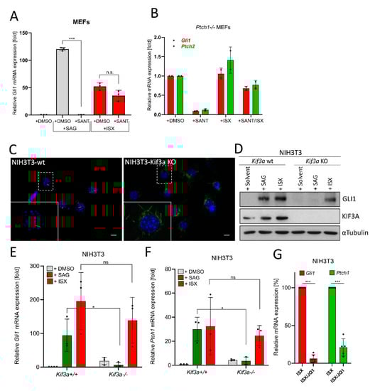 In a next step, we specifically queried the cilia-independence of ISX function. To this end, MEF cells were treated with the SMO antagonist SANT1 [28] to block Hh signaling at the level of primary cilia. As can be seen in Figure 4A (and Figure S4A), while the effects of the SMO agonist SAG were fully abrogated under SANT1 treatment (as expected), ISX was still capable of inducing Hh signaling in the presence of SMO inhibition. Similar findings were made when we used MEF cells with constitutive SMO activation due to the genetic depletion of Ptch1 [49] (Figure 4B). We continued our studies by generating NIH3T3 cells lacking Kif3a, a crucial component in cilia formation [50] (Figure 4C). In agreement with our previous data, ISX was capable of inducing GLI1 protein expression in wildtype and Kif3a knockout (KO) cells while SAG selectively lost this ability in KO cells (Figure 4D). This result was also verified on the Hh target gene level (Gli1, Ptch1) (Figure 4E,F) and could additionally be verified in transient Kif3a-knockdown experiments (Figure S4B,C). Finally, as upstream inhibition of Hh signaling by SANT1 or loss of cilia could not block ISX effects, we tested the BET-domain inhibitor JQ1, which functions at the level of GLI1/2 transcription [42]. In line with the results from our drug screen (Figure 3A), JQ1 was capable of blocking ISX function and abrogated ISX-induced Hh target gene stimulation (Figure 4G).