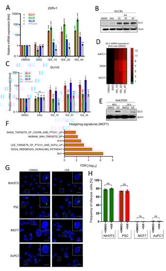 ISX activates GLI1 in a wide range of cell types. (A) Expression of Hh pathway genes in human prostate carcinoma cells (22Rv1). Treatment for 48 h with the indicated concentration of ISX (i.e., ISX_10: 10 µM ISX). SAG: 100 nM. Mean of n = 3 ± SD. (B) GLI1 immunoblot of treated DU145 cells. ISX concentrations (numbers) in [µM]. SAG: 100 nM. (C) Expression of Hh pathway genes in human prostate carcinoma cells (DU145). Treatment for 48 h with the indicated concentration of ISX (i.e., ISX_10: 10 µM ISX). SAG: 100 nM. Mean of n = 3 ± SD. (D) Heatmap summary of GLI1 expression (qPCR) in pancreatic AsPC1, breast MCF7 and kidney Hek293A cells. ISX concentrations [µM] as in (A). SAG: 100 nM. Shown is the mean of n = 3 (AsPC1; 293A) and n = 2 (MCF7) experiments. (E) GLI1 protein immunoblot of Hek293A cells treated for the indicated times. ISX: 20 µM. Shown is one representative example of two. (F) Hh-related transcriptome signatures (RNAseq) of ISX (20 µM, 48 h)-treated MCF7 cells versus DMSO control. (G) Primary cilia (AcTub, green) in various cell lines. Treatment with 20 µM ISX for 48 h. Nuclei appear in blue (DAPI). Scale bar is 10 µm. (H) Quantification of primary cilia as seen in (G). Shown is the mean of n = 3 experiments with at least 100 cells being counted for each condition in each experiment. Significances were indicated as ns (not significant; p > 0.05), * p < 0.05, ** p < 0.01, *** p < 0.001.