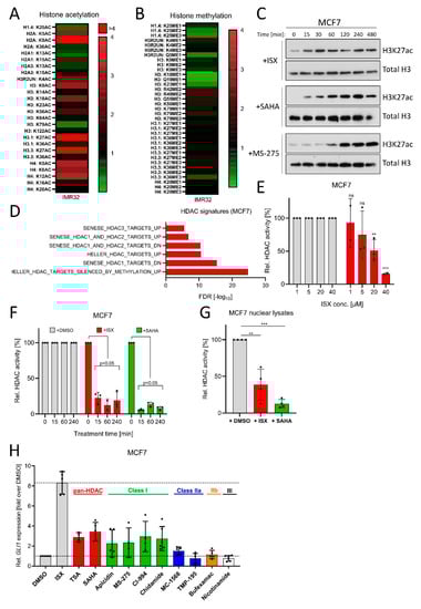 ISX possesses HDAC inhibitory functions. (A) Mass spectrometric determination of acetylated histone residues in IMR32 cells. Treatment with ISX (20 µM) for 8 h. (B) Mass spectrometric determination of methylated histone residues in IMR32 cells. Treatment with ISX (20 µM) for 8 h. (C) Western blot analysis of H3K27 acetylation kinetics in MCF7 cells treated with ISX (20 µM), SAHA (1 µM) or MS-275 (1 µM). Total histone H3 levels were used as normalizing control. Shown is one representative of n = 3 experiments. (D) HDAC-related transcriptome signatures (RNAseq) of ISX (20 µM, 48 h)-treated MCF7 cells versus DMSO control. (E) Cellular HDAC class I/II activity in MCF7 cells exposed to the indicated concentrations of ISX for 1 h. Shown is one experiment measured in duplicate/triplicate (mean ± SD). DMSO controls were set to 100%. (F) Cellular HDAC class I/II activity in MCF7 cells exposed to 20 µM ISX (or 5 µM SAHA) for the indicated times. Shown is one experiment measured in duplicate/triplicate (mean ± SD). DMSO controls were set to 100%. (G) Class I/II HDAC activity in isolated and lysed MCF7 nuclei, which were treated in vitro (10 min, RT) with DMSO (set to 100%), 20 µM ISX or 5 µM SAHA. Shown is one of n = 2 experiments measured in quadruplicate (mean ± SD). (H) GLI1 expression in MCF7 cells treated for 24 h with the indicated compounds. ISX: 20 µM; TSA: 0.5 µM; SAHA: 0.5 µM; Apicidin: 0.25 µM; MS-275: 1 µM; CI-994: 10 µM; Chidamide: 5 µM; MC-1568: 5 µM; TMP-195: 1 µM; Bufexamac: 50 µM; Nicotinamide: 10 mM. Mean of at least n = 4 ± SD. Significances were indicated as ns (not significant; p > 0.05), ** p < 0.01, *** p < 0.001.