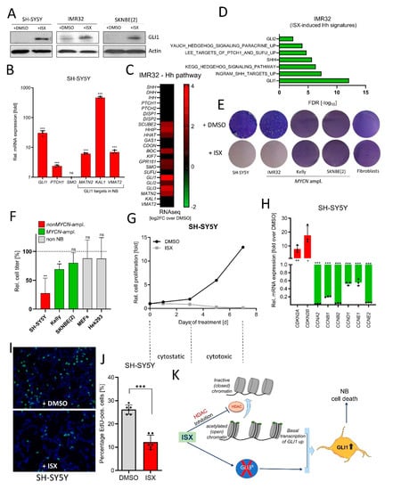Finally, we wanted to test the functional impact of ISX treatment on NB cells. In agreement with our previous data, ISX induced GLI1 protein (Figure 7A) and Hh pathway genes (Figure 7B) in several human NB cells. In addition, transcriptome analysis by means of RNAseq revealed the ISX-stimulated upregulation of Hh pathway genes (mostly strongly of GLI1) (Figure 7C) and the induction of Hh-dependent transcriptome signatures (Figure 7D) in IMR32 cells. In contrast to upstream Hh pathway agonists (Figure 2E), ISX was also able to strongly reduce NB cell proliferation of the non MYCN-amplified SH-SY5Y cell line (Figure 7E). This was not the case in two out of three MYCN-amplified cell lines (SKNBE(2), Kelly). Non-cancerous control cell lines such as fibroblasts or Hek293 cells were not grossly affected in their growth by ISX treatment (Figure 7E,F). In order to assess the contribution of GLI1 induction to the overall growth inhibitory effects of ISX, we generated GLI1-deficient SH-SY5Y cells (Figure S7A). Indeed, GLI1-KO cells were much less sensitive to ISX than GLI1-WT cells, albeit some anti-proliferative effect of ISX remained (Figure S7B). ISX-induced cell growth inhibition in SH-SY5Y cells was biphasic: in the first 2–3 days, ISX caused a cytostatic effect whereas a cytotoxic period followed afterwards during the days 3–7 (Figure 7G). Transcriptionally, ISX reduced the expression of many Cyclin genes such as CCNA2, CCNB2 or CCNE2 and induced the expression of the negative cell cycle regulators CDKN2A and CDKN2B (Figure 7H). Moreover, EdU-labelling revealed a significant reduction in NB cell proliferation upon ISX treatment (Figure 7I,J). Taken together, ISX induced GLI1 in NB cells and could strongly interfere with NB cell proliferation.