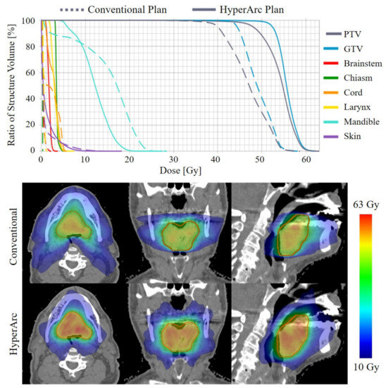 - Ho, H.-W.; Lee, S.P.; Lin, H.-M.; Chen, H.-Y.; Huang, C.-C.; Wang, S.-C.; Yang, C.-C.; Lin, Y.-W. Dosimetric comparison between RapidArc and HyperArc techniques in salvage stereotactic body radiation therapy for recurrent nasopharyngeal carcinoma. Radiat. Oncol. 2020, 15, 1–11. [Google Scholar] [CrossRef]