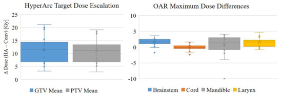 Target dose escalation and maximum OAR dose comparisons, plotted as the difference between the HyperArc (DHA) and conventional (DConv) plan doses, in Gy.