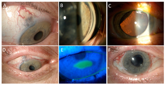 Scleral necrosis represents an uncommon complication after PBR, that can lead to perforation in the most severe cases [85]. Risk factors include tumour thickness higher than 6 mm and the involvement of the ciliary body [85]. In severe cases this complication may require kereatoplasty, possibly using a lamellar flap from the same eye [85]. The upper eyelid could also be damaged by PBR. The transpalpebral procedure has been proposed in order to avoid collateral damage to the upper eyelid margin without increasing the risk of failure of local tumour control [86]. In addition, the lacrimal drainage system could also be affected with the development of canaliculitis or punctal obstruction [73]. Other complications reported following PBP include pseudophakic bullous keratopathy (2%) and dry eye disease (6%) [84,87,88,89]. However, most studies reported no impairment of the ocular surface [67,75,90,91,92,93,94,95,96,97,98]. Figure 3 shows the management of toxicity in a patient affected by large cilio-choroidal melanoma with diffuse iris invasion, treated with PBR to the entire anterior segment.