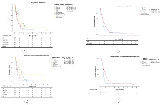 Progression-free survival of different first-line regimens. Patients receiving SSAs, PRRT, other chemotherapeutic regimens, targeted agents and multimodal combination approaches were subsumed under other. Median PFS is listed with 95% confidence intervals. All p values are delineated in comparison to platinum + etoposide (PE). (a) Comparison of the main treatment groups. (b) Comparison of PE vs. non-PE. (c) Comparison of the main treatment groups for pancreatic primary only. (d) Comparison of PE vs. non-PE for pancreatic primary only.