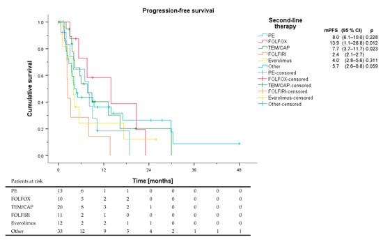 Ninety-nine patients received second-line systemic therapy with a median PFS of 5.6 months (Figure 3). The most frequent treatments were PE (n = 13), FOLFOX (n = 10), TEM/CAP (n = 20), FOLFIRI (n = 11), and everolimus (n = 12). The remaining 33 patients received a multitude of other treatments, each with n < 8, including PRRT (n = 7), SSAs (n = 5), targeted agents (n = 2), checkpoint inhibitors (n = 7), and other chemotherapy regimens (STZ/5-FU, n = 5, topotecan, n = 4). In second-line, patients receiving FOLFIRI showed the shortest PFS, significantly shorter than with FOLFOX or TEM/CAP. Both the highest ORR and DCR as well as the longest PFS could be observed for the FOLFOX group (Table 5). In the other groups, 6 responses were noted in 3 patients receiving PRRT, 1 patient receiving STZ/5-FU, and 2 patients with multimodal treatment. Of 7 patients receiving second-line treatment with an immune checkpoint inhibitor (all as monotherapy), no responses were detected. Looking at the features of second-line treated patients, while the median Ki67 in the 10 patients of the second-line FOLFOX group was 30%, only 5 patients had a pancreatic primary, and 50% had been refractory to first-line treatment (Supplementary Table S2).