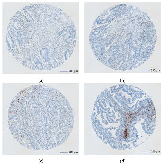 Immunohistochemistry (IHC) scan of PD-1 ligand (PD-L1) expression on immune cells at the tumor-stroma interface (Scanned images core X4). (a) PD-L1 < 1% (score 0); (b) PD-L1 of > 1–5% (score 1); (c) PD-L1 > 5%–< 50% (score 2); (d) PD-L1 > 50% (score 3).