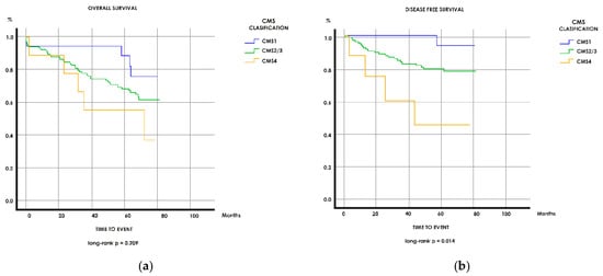 The aforementioned four-biomarker IHC panel and the MMR panel can identify the CMS4 and CMS1 subtypes, which have the worst and best prognosis, respectively. CMS2 and CMS3 account for more than 50% of the population and are indistinguishable from each other by these panels. This CMS2/CMS3 group includes patients with very different molecular characteristics [19] and survival [20,21,22,23]. Therefore, there is a need for new biomarkers that can provide clear expectations about prognosis, particularly for this group of patients.