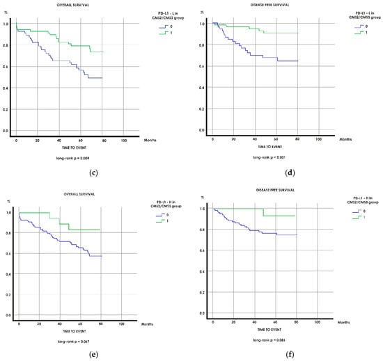 The Kaplan–Meier curves (Figure 2) for OS and DFS are consistent with previous results. With respect to OS and DFS, the CMS1 group displayed the longest survival, followed by the CMS2/CMS3 and finally the CMS4, which had the poorest outcome. In the subgroup analysis of CMS2/CMS3, PD-L1 expression significantly differentiated patients with good and poor prognosis for OS and time to relapse or death (p = 0.004 and p < 0.001, respectively).