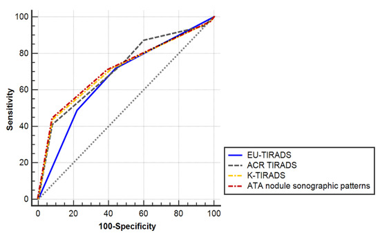 Receiver operating characteristic (ROC) curves of four ultrasonography-based risk stratification systems to predict thyroid malignancy in nodules with nondiagnostic or unsatisfactory cytopathological results.