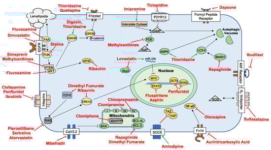 Cellular pathways and interactions detailing the key proposed mechanisms of drugs that have completed preclinical investigation and have yet to be fully studied in the clinical setting. Abbreviations: Adenosine diphosphate receptor (P2YR12); cyclic adenosine 3′,5′-cyclic monophosphate (cAMP); adenosine 3′,5′-cyclic monophosphate (AMP); phosphodiesterase (PDE); glycogen synthase kinase (GSK3B); phosphoinositide 3-kinase (PI3K); AMP-activated protein kinase (AMPK); microtubule-associated protein 1A/1B-light chain 3 phosphatidylethanolamine conjugate (LC3-II); signal transducer and activator of transcription 3 (STAT3); (sex determining region Y)-box 2 (SOX2); octamer-binding transcription factor 4 (OCT4); focal adhesion kinase (FAK); phosphatase and tensin homolog (PTEN); protein kinase B (AKT); eukaryotic translation initiation factor (eIF4e); S-phase kinase-associated protein 2 (Skp2); microRNA-33b (miRNA-33b); Macrophage migration inhibitory factor (MIF); reactive oxygen species (ROS); tafazzin (TAZ); yes associated protein (YAP); fibroblast growth factor-inducible 14 (Fn14); store-operated calcium entry (SOCE); isocitrate dehydrogenase 1 (IDH1); enhancer of zeste homolog 2 (EZH2); rat sarcoma (RAS); extracellular signal-regulated kinase (ERK); epidermal growth factor receptor (EGFR); t-type calcium channel (CaV3.2); Bcl-2-associated X protein (BAX); B-cell lymphoma 2 (BCL2); B-cell lymphoma-xL (BCL-XL); nuclear factor kappa-light-chain-enhancer of activated B cells (NF-KB).