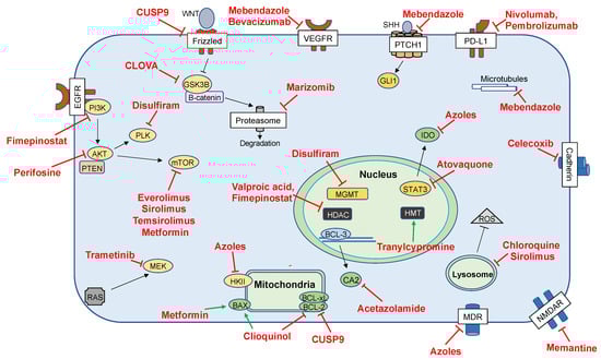Cellular pathways and interactions detailing the key proposed mechanisms of drugs that have completed preclinical investigation and have also been studied in clinically. Abbreviations: Histone deacetylase (HDAC); O6-methylguanine-DNA methyltransferase (MGMT); histone methyltransferase (HMT); carbonic anhydrase 2 (CA2); muli-drug resistance protein (MDR); N-methyl-D-aspartate receptor (NMDAR); Indoleamine 2,3-dioxygenase (IDO); glioma-associated oncogene (GLI1); protein patched homolog 1 (PTCH1); programmed death-ligand 1 (PD-L1); polo-like kinase 1 (PLK); mitogen-activated protein kinase kinase (MEK); mechanistic target of rapamycin (mTOR); hexokinase II (HKII); glycogen synthase kinase (GSK3B); phosphoinositide 3-kinase (PI3K); signal transducer and activator of transcription 3 (STAT3); phosphatase and tensin homolog (PTEN); protein kinase B (AKT); reactive oxygen species (ROS); rat sarcoma (RAS); extracellular signal-regulated kinase (ERK); vascular endothelial growth factor receptor (VEGFR); endothelial growth factor receptor (EGFR); Bcl-2-associated X protein (BAX); B-cell lymphoma 2 (BCL2); B-cell lymphoma-xL (BCL-XL): B-cell lymphoma 3-encoded protein (BCL-3).