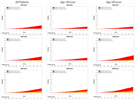 Clinical decision making in prostate cancer (PCa) patients is very complex and information on risk of long-term cancer specific mortality (CSM) and other-cause mortality (OCM) is essential to avoid over- and undertreatment. Previous reports from population-based or multi-institutional large series provide such information [1,2,3,4]. In these studies, patients were stratified in low-, intermediate-, and high-risk group according to the proposed risk group models based on preoperative prostate specific antigen (PSA), stage, and Gleason score [5,6]. However, recent evidence has shown that such stratification is not optimal and outcomes differ widely, especially in high-risk PCa patients [7,8,9]. Gleason score grading is an important factor for the prediction of cancer-specific survival and has been included in all PCa risk stratification models. Moreover, this parameter could be used as an independent predictor. Reports, especially those after 2014 International Society of Urological Pathology (ISUP) recommendations [10], demonstrate the growing role of Gleason score in prognosis of oncological outcomes. The new ISUP Grade Group (GG) model shows better performance in comparison with former Gleason grading both on prediction of biochemical progression-free survival [11,12] and the forecast of cancer-specific survival [13,14] and is now accepted and widely used [9]. Indeed, to transfer information of cancer-specific and overall survival from different reports to individual patient’s risk of dying from cancer or other causes is complicated. One of the most realistic ways to receive reliable information on mortality is competing risk analysis. Taking into consideration that Gleason grading is a key predictor of CSM, such data would be very useful and friendly to use for both clinicians and patients in order to choose the optimal personalized treatment option.
