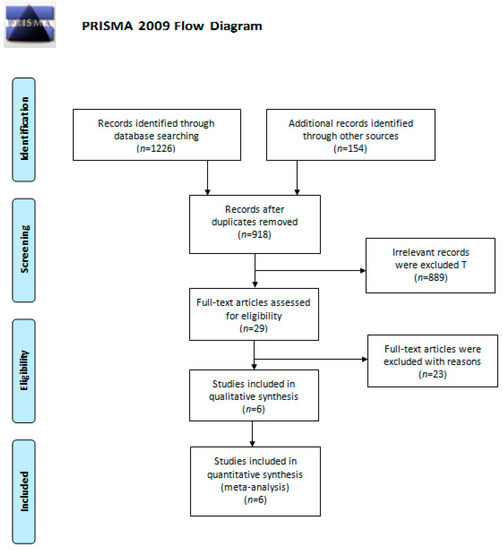 A total of 1380 studies were identified from a comprehensive literature search. After removing duplicate studies, we screened 918 studies based on their abstracts. Among them, 889 were excluded due to irrelevance, and the six remaining studies were included for qualitative synthesis and quantitative meta-analysis. The PRIMSA flow diagram is presented in Figure 1.