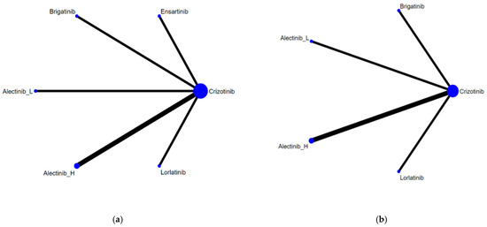Network constructions for comparisons in PFS, ORR, and grade 3–5 AEs: (a) Network constructions for PFS and ORR; (b) Network constructions for PFS subgroup analysis and grade 3–5 AEs.