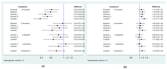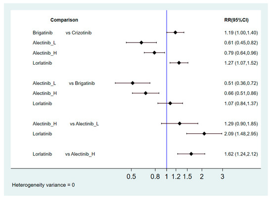 Lorlatinib and alectinib had better ORRs than crizotinib (response ratio (RR) = 1.31, 95% CI = 1.11–1.55 for lorlatinib, RR = 1.13, 95% CI = 1.03–1.24 for high-dose alectinib, RR = 1.16, 95% CI = 1.02–1.32 for low-dose alectinib), but there were no significant differences between the other ALKIs and crizotinib (RR = 1.18, 95% CI = 0.99–1.40 for brigatinib, RR = 1.11, 95% CI = 0.95–1.31 for ensartinib). Although no significantly superior effects were found, lorlatinib had a relatively better ORR than the other ALKIs (RR = 1.18, 95% CI = 0.94–1.48 for ensartinib, RR = 1.11, 95% CI = 0.88–1.42 for brigatinib, RR = 1.13, 95% CI = 0.92–1.39 for low-dose alectinib, RR = 1.16, 95% CI = 0.96–1.40 for high-dose alectinib). Additionally, lorlatinib was associated with the best ranking for ORR (highest SUCRA and Prbest, SUCRA = 90.3%, Prbest = 71.3%), followed by brigatinib (SUCRA = 61.0%), low-dose alectinib (SUCRA = 56.7%), high-dose alectinib (SUCRA = 46.4%), ensartinib (SUCRA = 42.9%), and crizotinib (SUCRA = 2.8%).