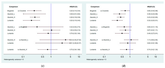 Summary of effect sizes for efficacy comparison: (a) Pairwise comparisons for PFS; (b) Pairwise comparisons for ORR; (c) Pairwise comparisons for PFS among patients with baseline brain metastasis; (d) Pairwise comparisons for PFS among patients without baseline brain metastasis.