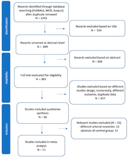 Studies with less than five patients were excluded, as well as reviews with no original data, case reports, comments, and letters. Studies that included other types of arterial resection (superior mesenteric artery) or celiac axis resection performed during other surgeries (such as pancreaticoduodenectomy or total pancreatectomy) were excluded when it was impossible to extrapolate data related to patients receiving DP-CAR only. Studies with different outcomes were also excluded. The selection process is summarized in the PRISMA flow chart.