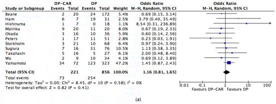 The PRISMA flow diagram is shown in Figure 1. Eleven studies [,,,,,,,,,,] comparing DP-CAR and standard DP, published between January 2005 and December 2020, were included in the meta-analysis. On data extraction, there was 100% agreement between the two reviewers. Five studies were conducted in Japan, two in the USA, one study was conducted in China, one in Denmark, one in Germany and one in South Korea. The reports were retrospective studies of comparable patients. No randomized trials were identified. A total of 1077 patients were included, of whom 221 (20%) underwent DP-CAR and 865 (80%) underwent standard DP. The characteristics of the studies are summarized in Table 1. The quality of the studies was assessed using the Newcastle–Ottawa Scale [] for cohort studies. Of the 13 studies, eight were assessed as high quality (scores between six and seven), and three had a score of five points (Table S2).