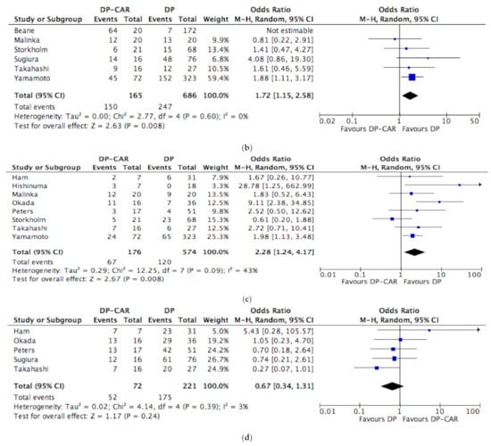 The rate of synchronous venous resection was higher in the DP-CAR group (OR 7.78, 95% CI 1.70 to 35.61, p = 0.008). Blood loss was statistically higher in the DP-CAR group (MD 66.75, 95% CI 26.83 to 106.67, p = 0.001) and operative time was longer in the DP-CAR group (MD 78.79, 95% CI 36.73 to 120.85, p = 0.002). Rates of positive margins (R+ resections) (OR 2.28, 95% CI 1.24 to 4.17, p = 0.008) were higher in the DP-CAR group (Figure 2c).