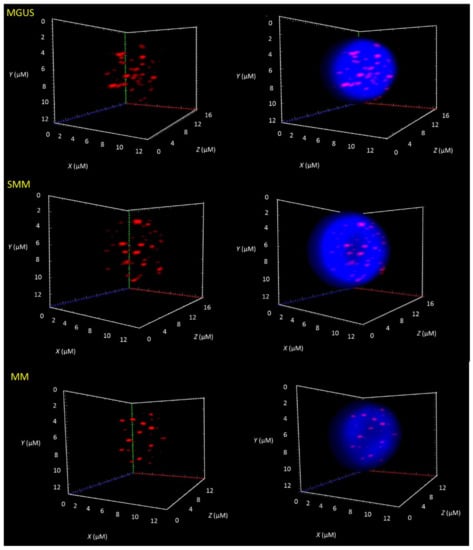 - Yu, P.L.I.; Wang, R.R.; Johnston, G.; Wang, Y.; Tammur, P.; Tamm, A.; Mai, S. Distinct Nuclear Organization of Telomeresand Centromeres in Monoclonal Gammopathyof Undetermined Significance and Multiple Myeloma. Cells 2019, 8, 723. [Google Scholar] [CrossRef]