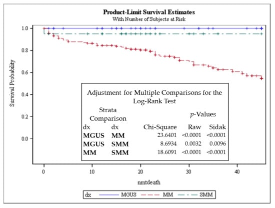 - Kyle, R.A.; Remstein, E.D.; Therneau, T.M.; Dispenzieri, A.; Kurtin, P.J.; Hodnefield, J.M.; Larson, D.R.; Plevak, M.F.; Jelinek, D.F.; Fonseca, R.; et al. Clinical Course and Prognosis of Smoldering (Asymptomatic) Multiple Myeloma. N. Engl. J. Med. 2007, 356, 2582–2590. [Google Scholar] [CrossRef]