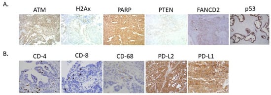Immunohistochemistry was performed, as previously described []. Sections (4 μm) were deparaffinized and pretreated in citrate buffer pH 6.0 for 20 min, cooled 20 min, and incubated 10 min at ambient temperature in 3% H2O2 to quench endogenous peroxidase activity. Blocking was performed using serum-free protein block, (Dakocytomation, Carpenteria, CA, USA) for 30 min. Sections were incubated with antibodies to ATM, FANCD2, PTEN, H2AX, PARP, p53, and CD4, CD8, CD68, FOXP3, PD-L1, and PD-L2 and conditions are summarized in Table 1 [].