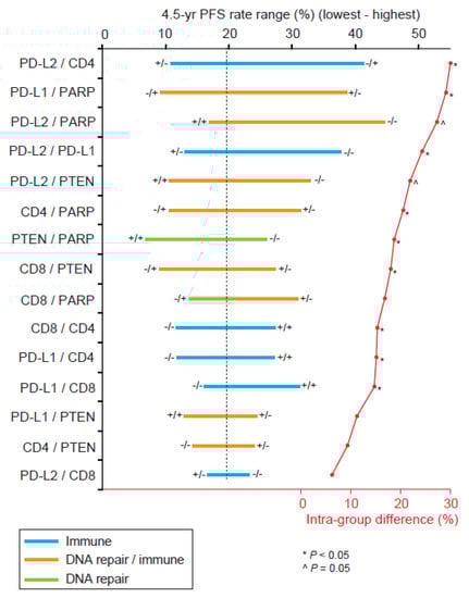 Discriminatory ability of progression-free survival based on protein microarray results. Among 6 biomarkers identified in multivariate analysis (Table 3), combination patterns of any two biomarkers were assessed (total 15 patterns). In each pattern, biomarker expression was assessed as negative/negative (−/−), negative/positive (−/+), positive/negative (+/−), and positive/positive (+/+). The cutoff definition of negative and positive results is displayed in Table 3. Then, the 4.5-year progression-free survival (PFS) rates were computed, and discriminatory ability defined as the difference between the lowest and highest rates was estimated and shown by red dots and line (displayed as the secondary axis for intra-group difference). A log-rank test was used for p-values (lowest vs. highest). Subgroups with fewer than ten cases were not interpreted for analysis due to insufficient number. Bars represent the highest PFS rate (right side) and the lowest PFS rate (left side) in each biomarker combination. The dashed line indicates the 4.5-year PFS rate of 19.7% for the entire study cohort.