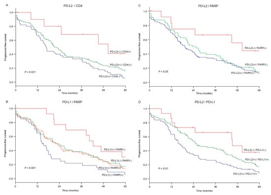 Survival curves for progression-free survival based on combination patterns. Survival curves are constructed with the Kaplan–Meier method per the combination pattern of biomarkers. (A) PD-L2 and CD4; (B) PD-L1 and PARP; (C) PD-L2 and PARP; (D) PD-L2 and PD-L1. In Figure panels (A,C,D), subgroups with small number (<9) were censored due to futility. Log-rank test for p-values.