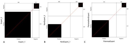 Agreement of readers stratified by experience: the panel shows the observed agreement between expert readers (A), non-expert readers (B) and pairwise observed agreement between expert and non-expert readers (C). The black square area indicates the exact observed agreement between the two operators while the white remaining area indicates the disagreement. We can observe that the agreement between expert readers is higher (A) compared to that observed with non-expert (B) or pairwise expert and non-expert readers (C).